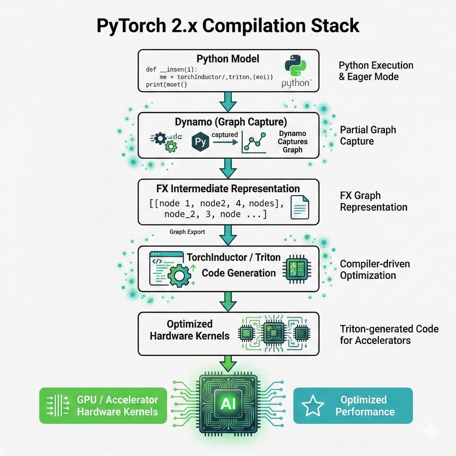 This is your normal PyTorch model code: nn.Module, forward pass, etc. - Torch Dynamo (Graph Capture)